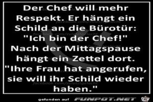 | Ich bin der Chef Bild (22.59 KB) 10Lustiges → klasse Sprüche und Witze | Lustiges → klasse Sprüche und Witze | 16.06.23-07:10 | ||