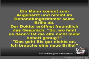 | Ein Mann kommt zum Augenarzt und nimmt im Behandlungszimmer Bild (45.92 KB) 7Lustiges → klasse Sprüche und Witze | Lustiges → klasse Sprüche und Witze | 11.06.23-09:24 | Fossy | |
