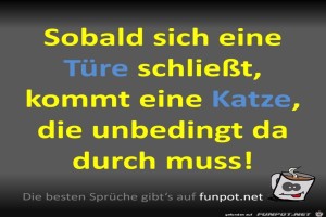 | Katzen eben Bild (75.36 KB) 9Lustiges → klasse Sprüche und Witze Das ist wirklich typisch Katze. Sie wollen ständig rein und raus. Und eine Tür, die zu ist, geht eh gar nicht :-) | Lustiges → klasse Sprüche und Witze | 12.06.23-09:41 | ||