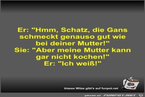 | Er: Hmm, Schatz, die Gans schmeckt genauso gut wie bei... Bild (32.38 KB) 3Lustiges → klasse Sprüche und Witze | Lustiges → klasse Sprüche und Witze | 10.06.23-15:01 | Fossy | |