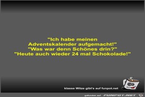 | "Ich habe meinen Adventskalender aufgemacht!" Bild (22.87 KB) 2Lustiges → klasse Sprüche und Witze | Lustiges → klasse Sprüche und Witze | 08.06.23-09:39 | Fossy | |