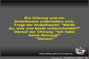 | Ein Chirurg und ein Anästhesist unterhalten sich Bild (33.43 KB) 5Lustiges → klasse Sprüche und Witze | Lustiges → klasse Sprüche und Witze | 08.06.23-11:57 | Fossy | |