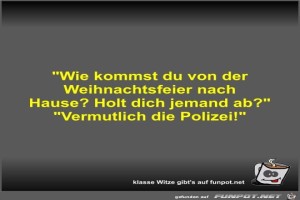 | Wie kommst du von der Weihnachtsfeier nach Hause? Bild (26.72 KB) 3Lustiges → klasse Sprüche und Witze | Lustiges → klasse Sprüche und Witze | 04.06.23-09:58 | Fossy | |