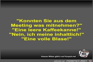 | Konnten Sie aus dem Meeting was mitnehmen? Bild (32.24 KB) 5Lustiges → klasse Sprüche und Witze | Lustiges → klasse Sprüche und Witze | 04.06.23-13:26 | Fossy | |