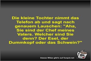 | Die kleine Tochter nimmt das Telefon ab und sagt nach... Bild (39.6 KB) von Fossy am 16. Juli 2025 um 09:04 Uhr Lustiges → klasse Sprüche und Witze  | Lustiges → klasse Sprüche und Witze | 16.07.-09:04 | Fossy | ||