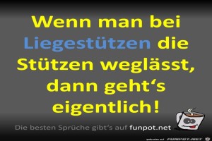 | Liegestützen Bild (76.81 KB) 9Lustiges → klasse Sprüche und Witze Im Liegen bin ich auch klasse. Nur mit dem Stützen sieht es schlecht aus :-) | Lustiges → klasse Sprüche und Witze | 30.05.23-13:43 | ||