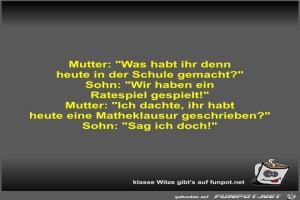 | Mutter: Was habt ihr denn heute in der Schule gemacht? Bild (31.41 KB) 9Lustiges → klasse Sprüche und Witze | Lustiges → klasse Sprüche und Witze | 16.05.23-13:10 | Fossy | |