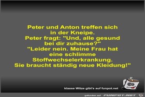 | Peter und Anton treffen sich in der Kneipe Bild (34.4 KB) 8Lustiges → klasse Sprüche und Witze | Lustiges → klasse Sprüche und Witze | 17.05.23-11:04 | Fossy | |