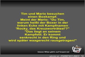 | Tim und Mario besuchen einen Boxkampf Bild (40.32 KB) 6Lustiges → klasse Sprüche und Witze | Lustiges → klasse Sprüche und Witze | 16.05.23-18:40 | Fossy | |