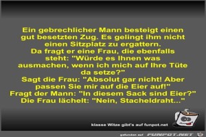 | Ein gebrechlicher Mann besteigt einen gut besetzten Zug Bild (52.13 KB) 6Lustiges → klasse Sprüche und Witze | Lustiges → klasse Sprüche und Witze | 12.05.23-16:41 | Fossy | |