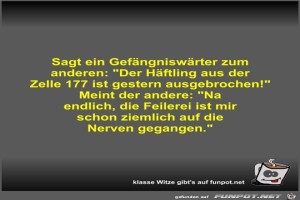 | Sagt ein Gefängniswärter zum anderen Bild (33.93 KB) 6Lustiges → klasse Sprüche und Witze | Lustiges → klasse Sprüche und Witze | 09.05.23-17:30 | Fossy | |