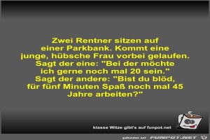 | Zwei Rentner sitzen auf einer Parkbank Bild (38.85 KB) 8Lustiges → klasse Sprüche und Witze | Lustiges → klasse Sprüche und Witze | 11.05.23-13:12 | Fossy | |
