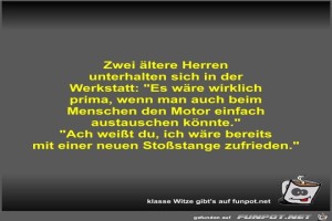 | Zwei ältere Herren unterhalten sich in der Werkstatt Bild (35.33 KB) 4Lustiges → klasse Sprüche und Witze | Lustiges → klasse Sprüche und Witze | 11.05.23-17:19 | Fossy | |