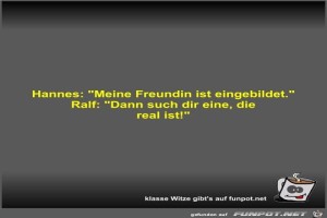 | Hannes: Meine Freundin ist eingebildet Bild (18.64 KB) 3Lustiges → klasse Sprüche und Witze | Lustiges → klasse Sprüche und Witze | 10.05.23-11:24 | Fossy | |