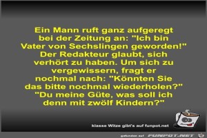 | Ein Mann ruft ganz aufgeregt bei der Zeitung an Bild (48.61 KB) 6Lustiges → klasse Sprüche und Witze | Lustiges → klasse Sprüche und Witze | 27.04.23-18:11 | Fossy | |