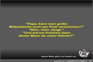 | Papa, kann man große Möbelstücke auch per Post verschicken? Bild (25.88 KB) 4Lustiges → klasse Sprüche und Witze | Lustiges → klasse Sprüche und Witze | 19.04.23-10:48 | Fossy | |