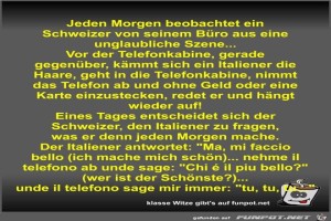 | Jeden Morgen beobachtet ein Schweizer von seinem Büro aus... Bild (73.74 KB) 3Lustiges → klasse Sprüche und Witze | Lustiges → klasse Sprüche und Witze | 18.04.23-17:56 | Fossy | |