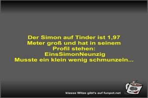 | Der Simon auf Tinder ist 1 Bild (25.65 KB)  1Lustiges → klasse Sprüche und Witze  | Lustiges → klasse Sprüche und Witze | 09.07.-11:00 | Fossy | |