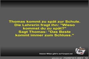 | Thomas kommt zu spät zur Schule Bild (28.57 KB) 4Lustiges → klasse Sprüche und Witze | Lustiges → klasse Sprüche und Witze | 10.04.23-18:47 | Fossy | |