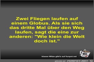 | Zwei Fliegen laufen auf einem Globus Bild (35.06 KB) 4Lustiges → klasse Sprüche und Witze | Lustiges → klasse Sprüche und Witze | 07.04.23-18:53 | Fossy | |