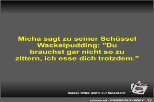| Micha sagt zu seiner Schüssel Wackelpudding Bild (27.54 KB) 5Lustiges → klasse Sprüche und Witze | Lustiges → klasse Sprüche und Witze | 05.04.23-13:54 | Fossy | |