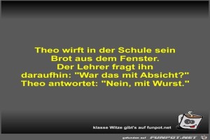 | Theo wirft in der Schule sein Brot aus dem Fenster Bild (28.79 KB) 4Lustiges → klasse Sprüche und Witze | Lustiges → klasse Sprüche und Witze | 05.04.23-18:43 | Fossy | |