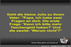 | Geht die kleine Julia zu ihrem Vater Bild (37.46 KB) 6Lustiges → klasse Sprüche und Witze | Lustiges → klasse Sprüche und Witze | 29.03.23-16:56 | Fossy | |