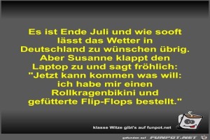 | Es ist Ende Juli und wie sooft lässt das Wetter in... Bild (46.28 KB) 7Lustiges → klasse Sprüche und Witze | Lustiges → klasse Sprüche und Witze | 20.03.23-15:47 | Fossy | |