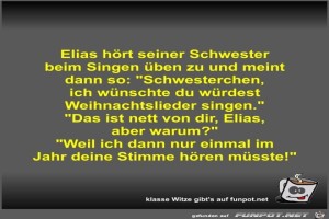 | Elias hört seiner Schwester beim Singen üben zu und meint... Bild (42.84 KB) 4Lustiges → klasse Sprüche und Witze | Lustiges → klasse Sprüche und Witze | 15.03.23-18:29 | Fossy | |