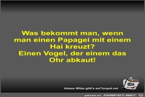 | Was bekommt man, wenn man einen Papagei mit einem Hai... Bild (27.94 KB) 3Lustiges → klasse Sprüche und Witze | Lustiges → klasse Sprüche und Witze | 16.03.23-18:15 | Fossy | |