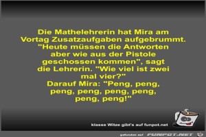 | Die Mathelehrerin hat Mira am Vortag Zusatzaufgaben... Bild (40.95 KB) 1Lustiges → klasse Sprüche und Witze | Lustiges → klasse Sprüche und Witze | 14.03.23-13:11 | Fossy | |