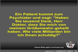 | Ein Patient kommt zum Psychiater und sagt Bild (39.34 KB) 8Lustiges → klasse Sprüche und Witze | Lustiges → klasse Sprüche und Witze | 13.03.23-14:06 | Fossy | |