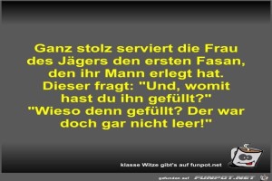 | Ganz stolz serviert die Frau des Jägers den ersten Fasan Bild (39.51 KB) 4Lustiges → klasse Sprüche und Witze | Lustiges → klasse Sprüche und Witze | 07.03.23-14:57 | Fossy | |
