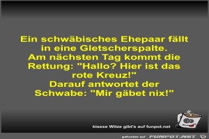| Ein schwäbisches Ehepaar fällt in eine Gletscherspalte Bild (37.72 KB) 5Lustiges → klasse Sprüche und Witze | Lustiges → klasse Sprüche und Witze | 06.03.23-14:34 | Fossy | |