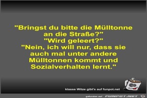 | Bringst du bitte die Mülltonne an die Straße? Bild (35.17 KB) 3Lustiges → klasse Sprüche und Witze | Lustiges → klasse Sprüche und Witze | 07.03.23-11:50 | Fossy | |