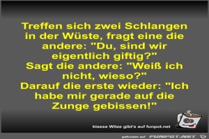| Treffen sich zwei Schlangen in der Wüste Bild (47.26 KB) 6Lustiges → klasse Sprüche und Witze | Lustiges → klasse Sprüche und Witze | 25.02.23-12:16 | Fossy | |