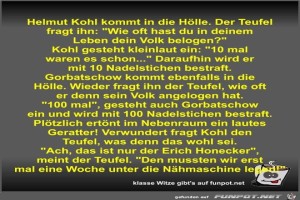 | Helmut Kohl kommt in die Hölle Bild (72.54 KB) 3Lustiges → klasse Sprüche und Witze | Lustiges → klasse Sprüche und Witze | 26.02.23-14:20 | Fossy | |
