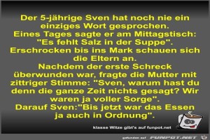 | Der 5-jährige Sven hat noch nie ein einziges Wort gesprochen Bild (64.92 KB) 5Lustiges → klasse Sprüche und Witze | Lustiges → klasse Sprüche und Witze | 22.02.23-13:40 | Fossy | |