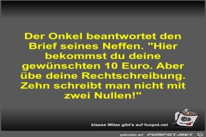 | Der Onkel beantwortet den Brief seines Neffen Bild (41.29 KB) 9Lustiges → klasse Sprüche und Witze | Lustiges → klasse Sprüche und Witze | 21.02.23-19:27 | Fossy | |