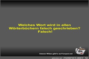 | Welches Wort wird in allen Wörterbüchern falsch geschrieben? Bild (19.2 KB) 4Lustiges → klasse Sprüche und Witze | Lustiges → klasse Sprüche und Witze | 13.02.23-11:24 | Fossy | |