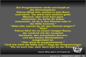 | Ein Programmierer stirbt und klopft an die Himmelspforte Bild (56.01 KB) 4Lustiges → klasse Sprüche und Witze | Lustiges → klasse Sprüche und Witze | 12.02.23-13:17 | Fossy | |