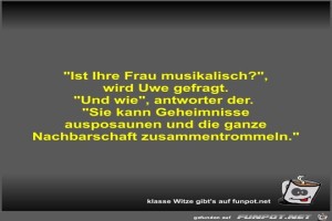 | Ist Ihre Frau musikalisch? Bild (29.95 KB) 9Lustiges → klasse Sprüche und Witze | Lustiges → klasse Sprüche und Witze | 01.01.23-13:43 | Fossy | |