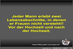 | Jeder Mann erlebt zwei Lebensabschnitte Bild (31.89 KB) 6Lustiges → klasse Sprüche und Witze | Lustiges → klasse Sprüche und Witze | 30.12.22-18:18 | Fossy | |