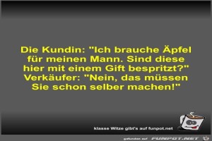 | Die Kundin: Ich brauche Äpfel für meinen Mann Bild (32.77 KB) 6Lustiges → klasse Sprüche und Witze | Lustiges → klasse Sprüche und Witze | 29.12.22-10:56 | Fossy | |