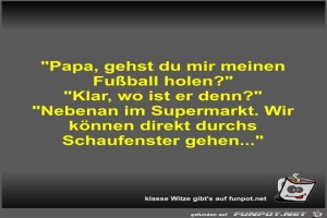 | Papa, gehst du mir meinen Fußball holen? Bild (33.44 KB) 5Lustiges → klasse Sprüche und Witze | Lustiges → klasse Sprüche und Witze | 28.12.22-16:29 | Fossy | |