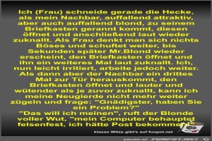 | Ich (Frau) schneide gerade die Hecke Bild (106.27 KB) 8Lustiges → klasse Sprüche und Witze | Lustiges → klasse Sprüche und Witze | 26.12.22-11:12 | Fossy | |