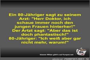 | Ein 80-Jähriger sagt zu seinem Arzt Bild (41.78 KB) 3Lustiges → klasse Sprüche und Witze | Lustiges → klasse Sprüche und Witze | 20.12.22-09:32 | Fossy | |