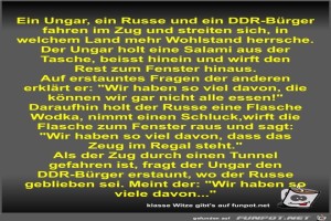| Ein Ungar, ein Russe und ein DDR-Bürger fahren im Zug und... Bild (89.36 KB) 5Lustiges → klasse Sprüche und Witze | Lustiges → klasse Sprüche und Witze | 18.12.22-17:22 | Fossy | |