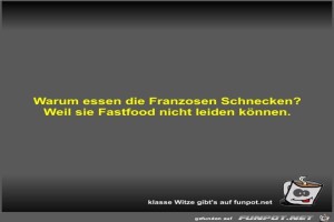 | Warum essen die Franzosen Schnecken? Bild (17.96 KB) 5Lustiges → klasse Sprüche und Witze | Lustiges → klasse Sprüche und Witze | 25.11.22-11:23 | Fossy | |