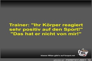 | Trainer: "Ihr Körper reagiert sehr positiv auf den Sport!" Bild (24.99 KB) 6Lustiges → klasse Sprüche und Witze | Lustiges → klasse Sprüche und Witze | 26.11.22-10:14 | Fossy | |